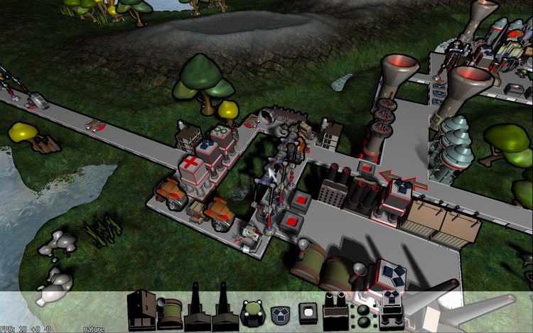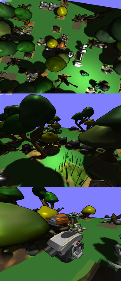 The all new engine that supports the game tries to give the whole a cute appearance with cartoon-outlining, and fuzzy shadowmaps. The screens to the side are initial engine tests with randomly generated levels just showing some of the objects & animated characters. The one above is the latest build.