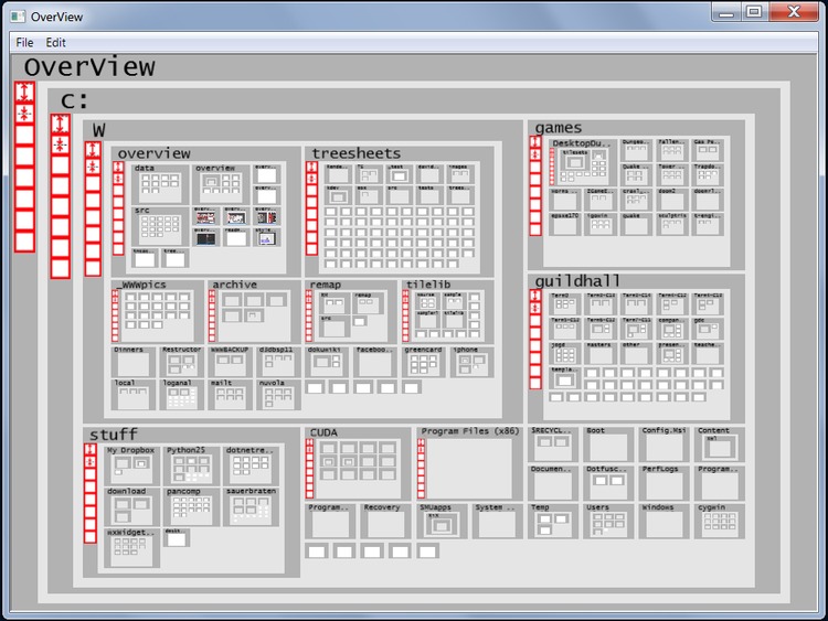 To improve on this, overview allows you to designate the relative importance of folders, so you can more quickly find what you’re looking for. In the above shot, the “W” folder is biggest, as it contains current projects. Inside of that, the overview folder is made bigger, in fact it takes up much more space than root folders like “Program Files” which are accessed infrequently by the user.
