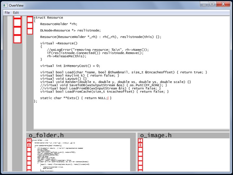 As cool as OverView was, it has some major usability issues, which made me decide to go with a different approach, ultimately leading to TreeSheets. The primary thing was that even though zooming was fun and intuitive, you always end up looking at your data at the wrong size, i.e. text was always either way too big or unreadable, and images almost never looked sharp because they hardly ever correspond to 1:1 pixels. For productive work with data, seeing stuff instantly at their ideal resolution works much better.